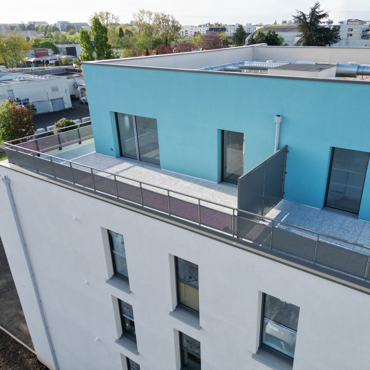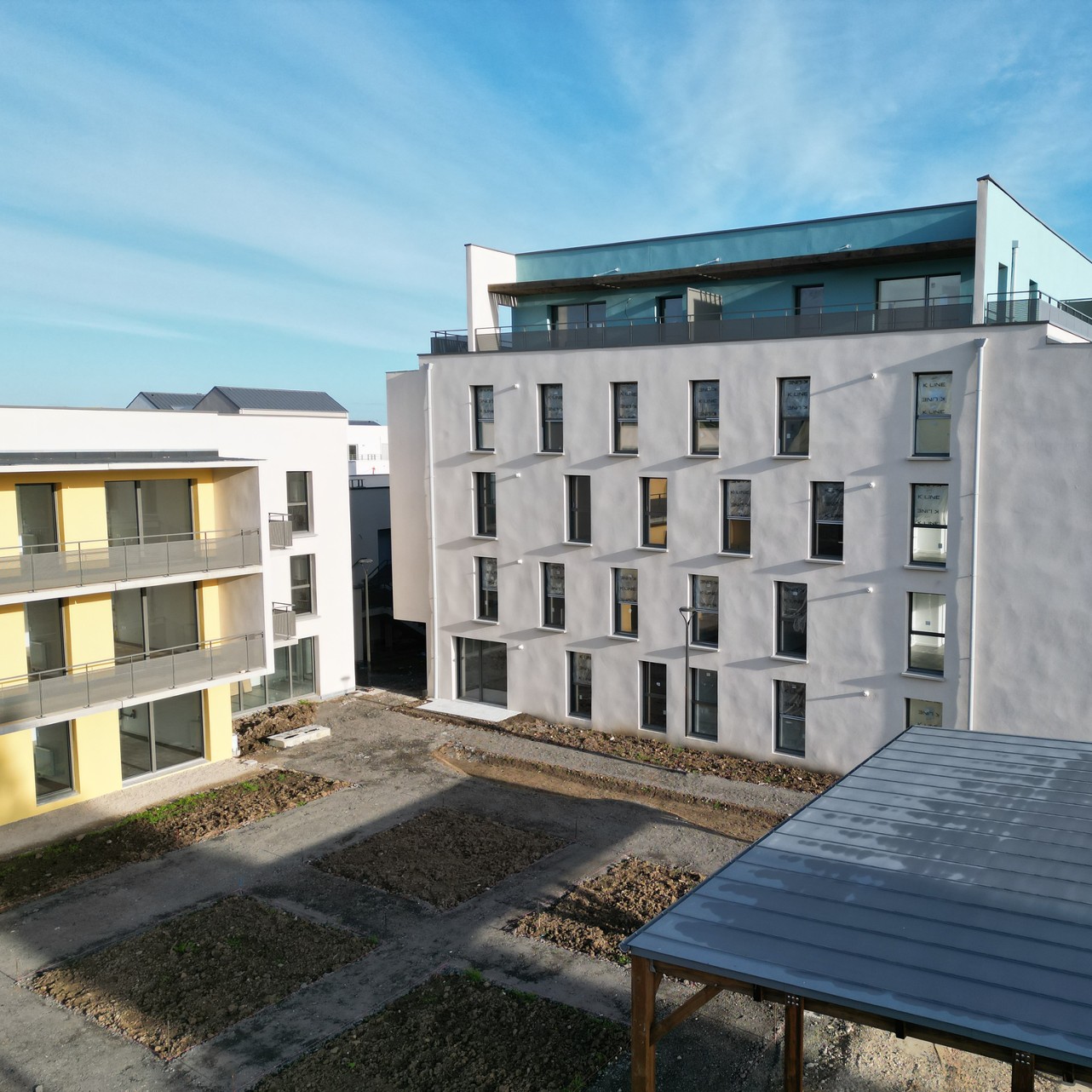 Intégration de pergolas et de surfaces végétalisées pour limiter les îlots de chaleur urbains. Et cerise sur le gâteau : la terrasse témoin du chantier est validée, nous permettant de passer à l’équipement de tous les logements.